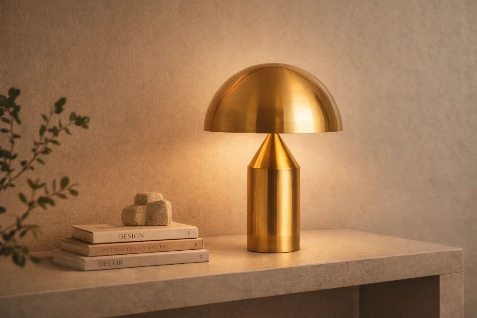 Aureo Dome is a refined expression of modern simplicity. Its smooth, dome-shaped shade rests upon a sculpted base, creating a balanced silhouette that feels both bold and understated. The warm metallic finish reflects light softly, bringing a sense of quiet luxury and calm atmosphere to any setting.